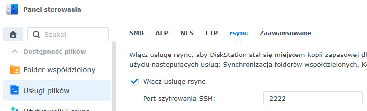 Najpierw trzeba włączyć rsync po stronie Syno.
