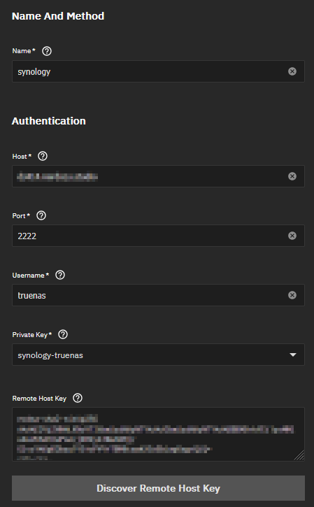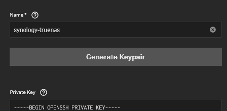 Następnie w panelu Credentials -> Backup credentials wygenerowałem nowy klucz dla połączenia do Syno i dodałem go na DS414 dla użytkownika truenas