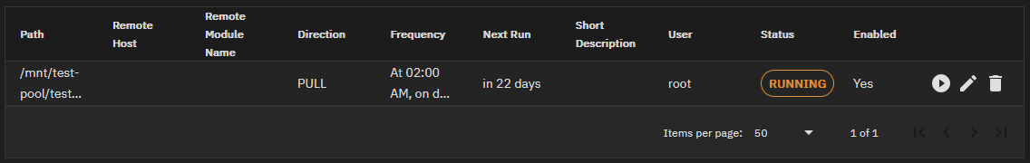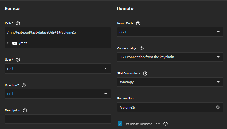 Przyszła pora na skonfigurowanie backupu. W panelu Data Protection -> Rsync Tasks dodałem nowego job'a. Najważniejsze ustawienia to ścieżki oraz kierunek połączenia na Pull